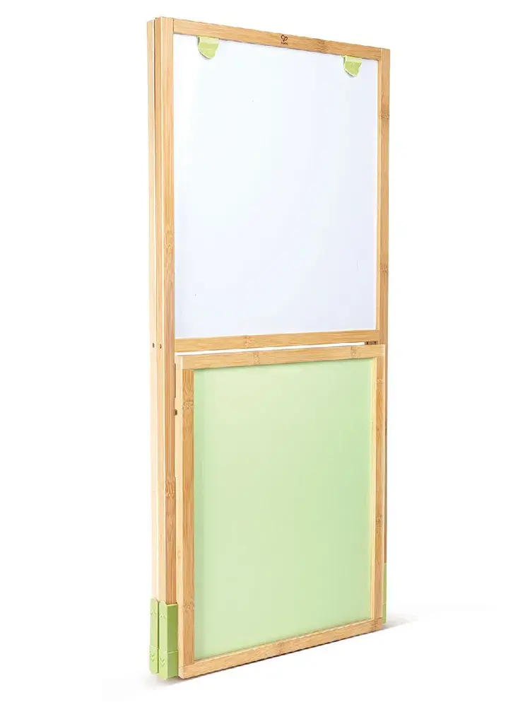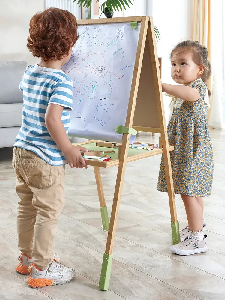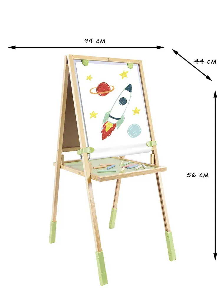 Этот тонкий складной деревянный мольберт можно легко установить и убрать, не отвинчивая никаких винтов. Двусторонняя конструкция позволяет играть одновременно двум детям. Бумажный рулон и зажимы во всех четырех углах удерживают бумагу на месте. Поднос можно использовать для хранения всех ваших художественных принадлежностей, и он всегда находится в пределах легкой досягаемости. Уникальный дизайн 3-в-1 позволяет детям экспериментировать с различными материалами и поверхностями для рисования. В комплекте коробка с 12 мелками и один рулон бумаги. Длину ножек можно отрегулировать на три высоты от пола: 46 см., 51,5 см., 55,5 см..